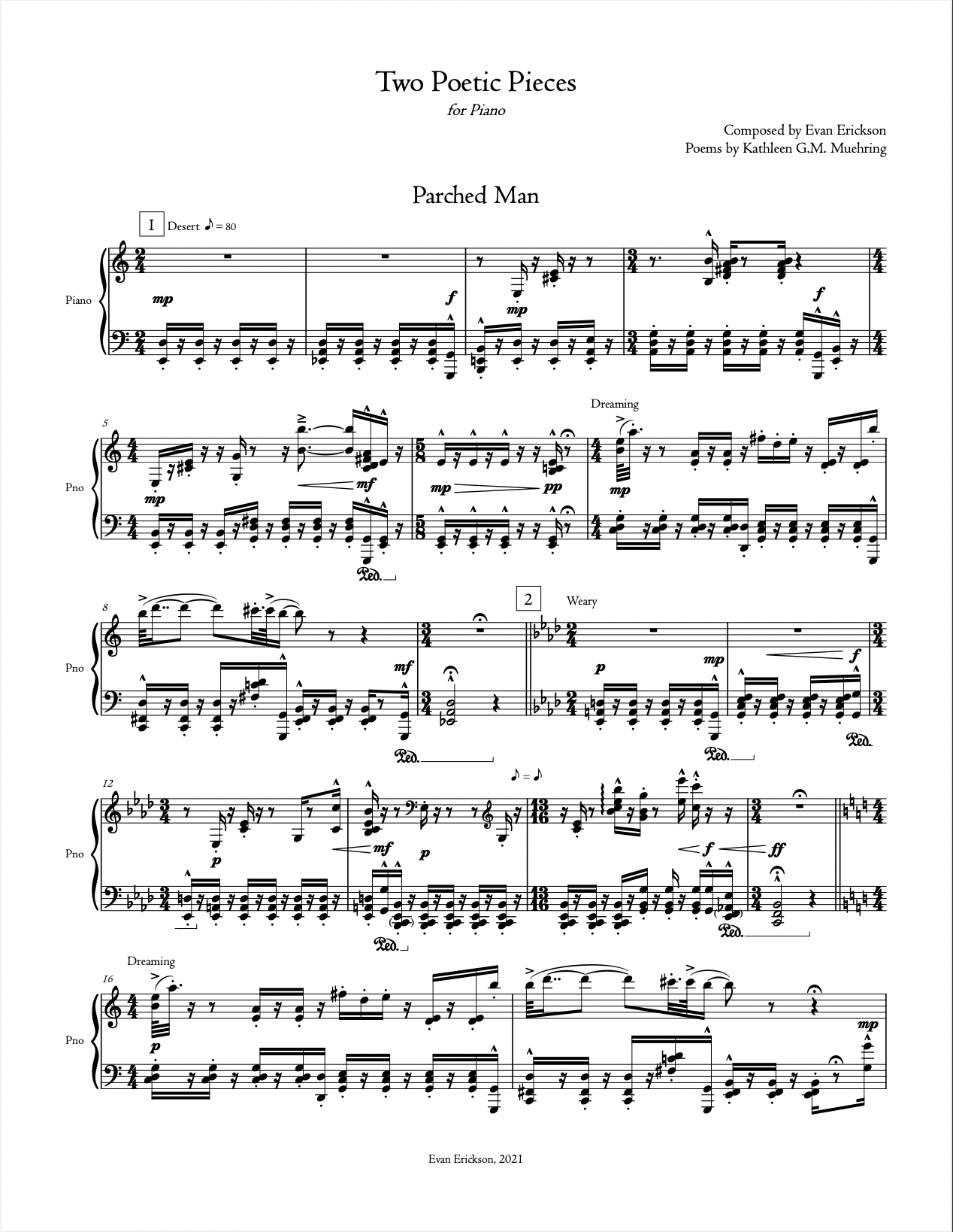 In both "Parched Man" and "Stories of Light," the rehearsal marks are meant to follow the poems. Part 1 of "Parched Man" is a man struggling to walk through a desert before he feels saved to find the pond. But, at the end of his slumber, he finds the pond is undrinkable and the section ends on a tense chord! Part 2 is where the character is more exhausted, and there is less hope in sight. As he dreams again, he feels content. Part 3 ends with a slower and prettier version of the "Dreaming" sections to personify the woman who drinks from the first pond. I ended this piece on a questionable but happy chord, as the parched man was not in distress in the end. He was able to find comfort in his dreams.